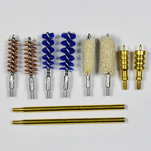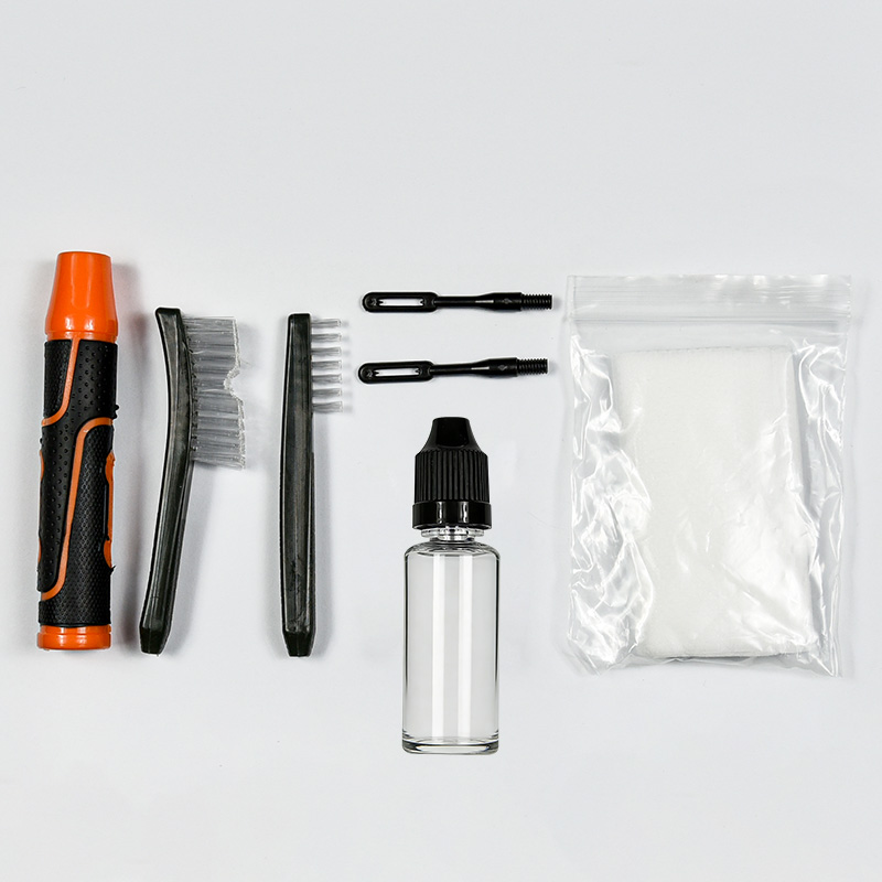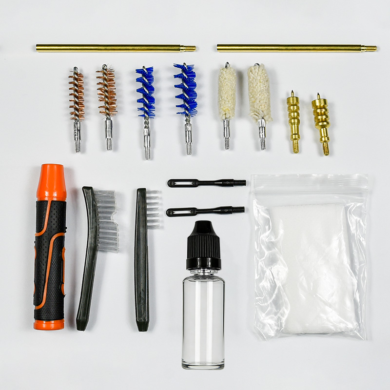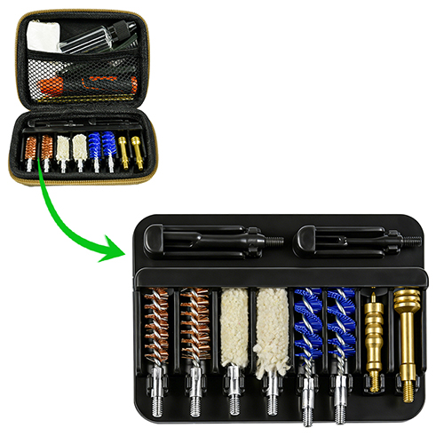 Kit pembersih pistol kalebu 2 ukuran (9mm & .45 kal.). Dilapisi kain OX PVC kasus karo zip. sikat kuningan, kain pel, sikat nilon, kuningan jags, 2 rodok. Werna wedhi lan ireng kanggo pilihan.