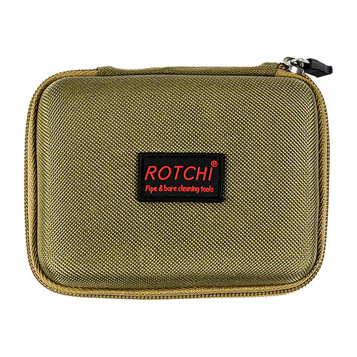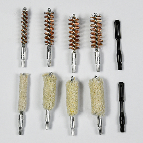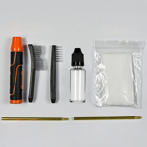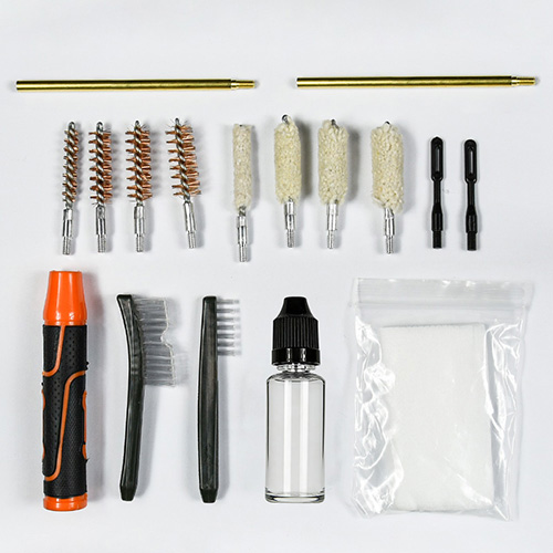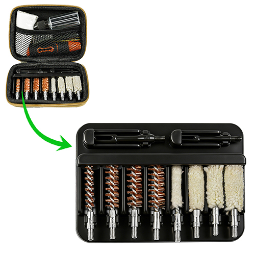 Kit cleaning handgun kalebu 4 ukuran (.22, 9mm, .40, .45cal.). Dilapisi kain OX PVC kasus karo zip. Sikat kuningan lan pel katun, 2 batang. Sands lan ireng werna kanggo pilihan.