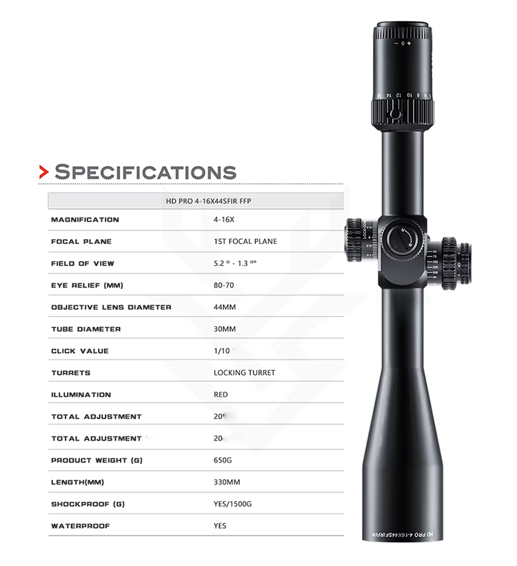 Optik HD Pro 4-16x44 SFIR FFP Tingkat High Tingkat High Taktik 30mm Tube