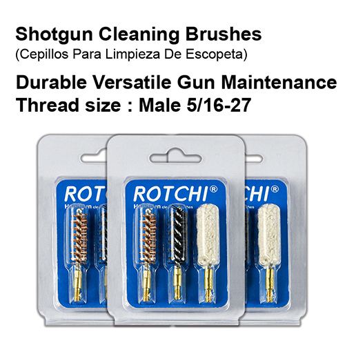 Shotgun bore sikat pembersih 3-in-1 set, blister lan kertu paket. Ukuran sing kasedhiya: 12G, 16G, 20G, 410